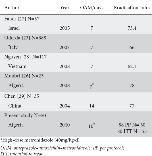 H pylori treatment dosage. The aim of this study was to investigate helicobacter pylori eradication rate using a short regimen 7 and 10 days of triple therapy with clarithromycin amoxicillin and omeprazole. Helicobacter pylori infection presents high prevalence in developing countries but there are few pediatric assays evaluating antimicrobial treatment. Mild to moderate renal dysfunction. Ten day quadruple therapy comprising low dose rabeprazole bismuth amoxicillin and tetracycline is an effective and safe first line treatment for helicobacter pylori infection in population with high antibiotic resistance.