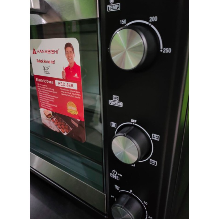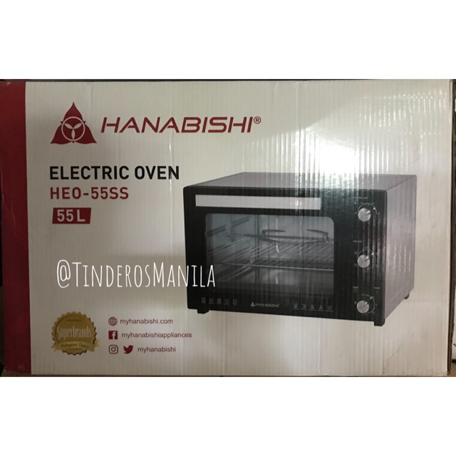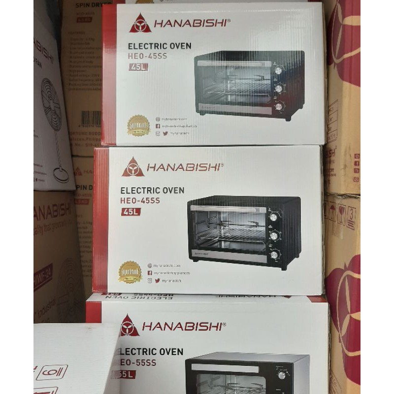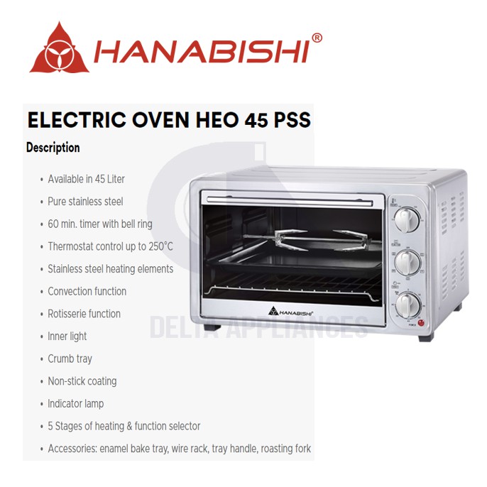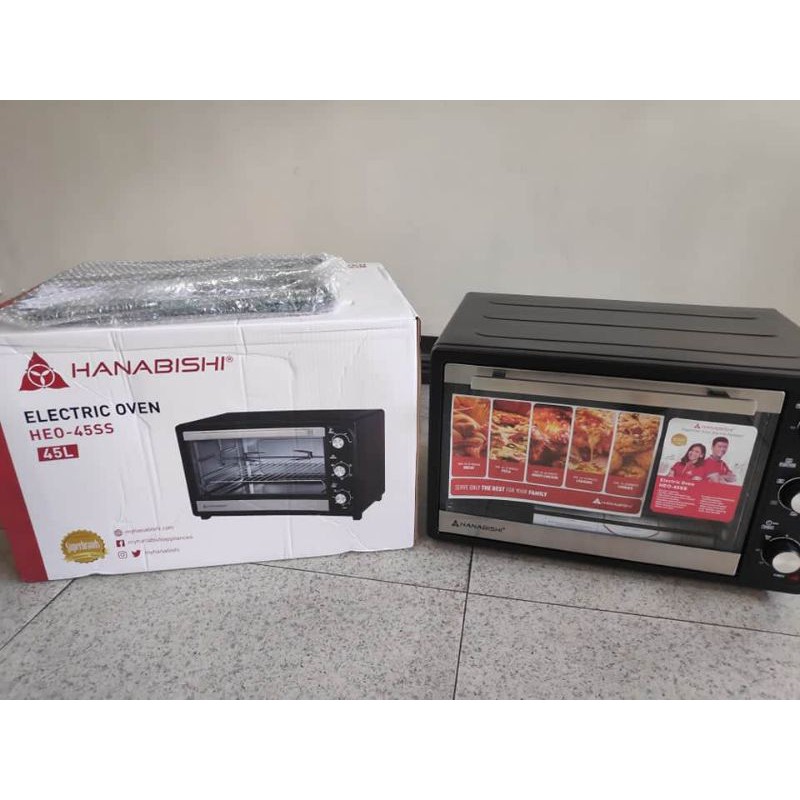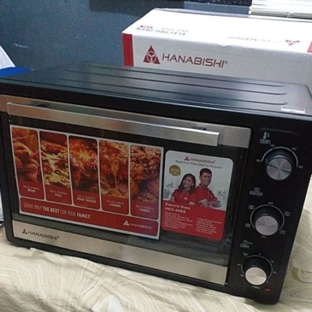 Timer with bell ring thermostat control up to 250 c stainless steel heating elements convection function rotisserie function inner light crumb tray non stick coating indicator lamp black housing 5 stages of heating f. Get the cheapest hanabishi electric oven heo 45ss price list latest reviews specs new used units and more at iprice. Hanabishi electric oven heo 45ss php 5 000 45 liter capacity 60 min. Available in discounted rate.