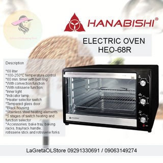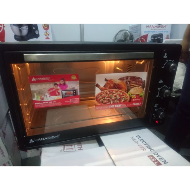 Hanabishi heo 45ss 45l electric oven black. 68 liter 100 250 c temperature control 60 min. Hanabishi electric oven heo 45l. Timer with bell ring with convection function with rotisserie function inner light indicator lamp heater selector switch tempered glass door black housing stainless steel heating elements 5 stages of switch heating and function selector accessories. 22 16 14 in.